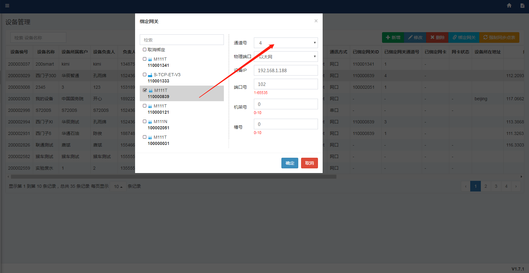2. 后臺通道與平臺上所選通道不一致,網關后臺“工控數據 - 通道管理”打開的是通道1,思普云平臺設備管理處,設備綁定網關時通道選擇1。
