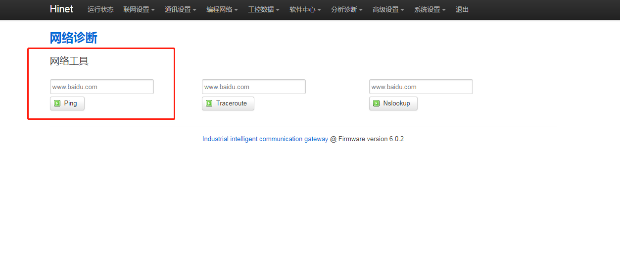 2.PLC的IP是否錯誤,進網關后臺,點擊“分析診斷 - 網絡診斷”,輸入PLC的IP點擊【ping】,如果網關LAN口IP與PLC的IP在同網段,而此處ping不通PLC的IP,則PLC的IP錯誤,請確認PLC的IP并修改。